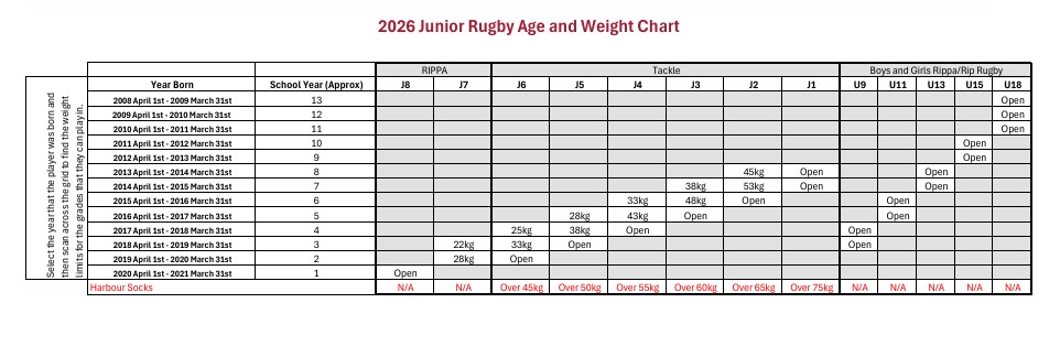 2026 Junior Rugby Age and Weight Chart