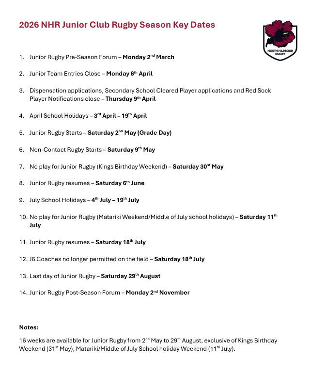 North Harbour Junior Club Rugby Key Dates